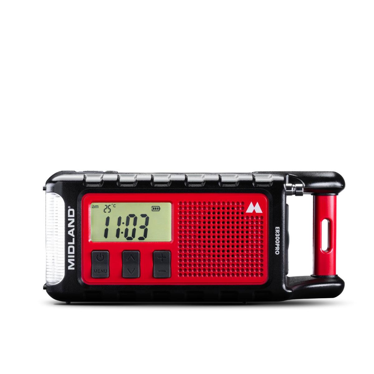 La radio de survie MIDLAND ER300 PRO est une radio de survie à énergie autonome, pouvant être rechargée de 3 manières différentes : par dynamo, par énergie solaire et par port USB.